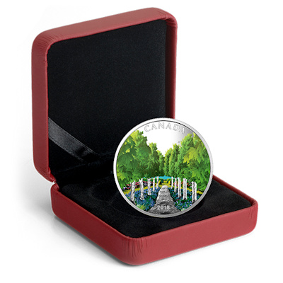 maple-tree-tunnel-1-oz-silber-koloriert-2Ein schöner Garten ist das perfekte Zusammenspiel von Natur und geschickter Planung. Die „Gärtner“ der Royal Canadian Mint haben für diese Silbermünze einen weitläufigen, klassischen Garten angelegt. Mittig lenkt ein silberner Weg den Blick in eine üppige Allee von Zuckerahornbäumen. Im Schatten ihrer tiefgrünen Kronen sorgt Katzenminze für einen blauen Farbtupfer. Im Hintergrund sind sorgfältig geschnittene Hecken und Rosen zu erkennen. Das Motiv ist jedoch nicht nur eine gelungene Kombination von Prägung und Farbapplikationen, sondern verbirgt eine weitere Ebene, die sich nur im Schwarzlicht enthüllt: Plötzlich wird es Herbst im Garten. Die Ahornbäume sind leuchtende Säulen aus Bernstein und Rot und auch am Boden strahlen einige intensiv gefärbte Herbstblätter zwischen den Funkien.