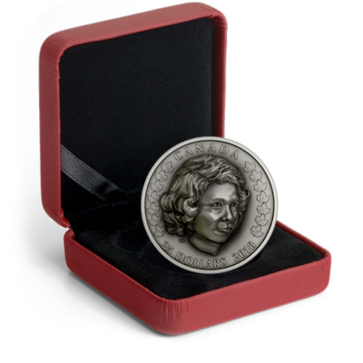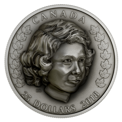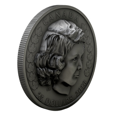So viel Engagement verdient eine besondere Silbermünzen-Serie, Deshalb hat sich die Royal Canadian Mint für die Queen auch etwas Außergewöhnliches einfallen lassen. Wie ein in das Silber getriebenes Motiv wirkt die Darstellung der jungen Elizabeth: Das Porträt ist bis zu 5 Millimeter hoch! Die Perspektive ist angelehnt an die bekannten Münzporträts der Monarchin; allerdings ist sie statt im Profil nur im Dreiviertelprofil abgebildet, um das High Relief richtig zur Geltung bringen zu können. Das fein modellierte Gesicht der Pinzessin wird von ordentlich frisierten Locken eingerahmt, die detailreich herausgearbeitet sind. Links und rechts dieses hübschen Kinderporträts sind Ahornblätter als Symbol für Kanada in das Motiv integriert. Unten findet man den Nennwert von 25 CAD.