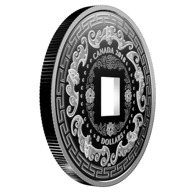 Fünf Fledermäuse mit ausgebreiteten Flügeln bilden auf dem Motiv der Silbermünze einen Kreis. Unten findet man den Nennwert von 8 CAD, oben das Herkunftsland Canada und die Jahreszahl 2018. Zur Mitte hin schließt sich ein Kreis mit Blütenornamenten an. Da die Fledermäuse für das Yang- und die Blüten für das Yin-Prinzip stehen, wird so Harmonie hergestellt. Den Mittelpunkt der Silbermünze bildet ein viereckiges Loch. Damit erinnert sie an antike chinesische Münzen. Diese wurden mit einem Loch versehen, um sie auf Schnüre aufziehen zu können. Das eckige Loch wird dabei als Symbol für das Land interpretiert, während die runde Form der Münze für den Himmel steht.