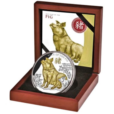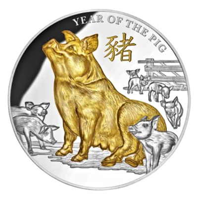 Das Motiv der Silbermünze zeigt eine aufwendig vergoldete Sau umgeben von putzigen Ferkeln. Sie hat den Kopf stolz erhoben und trägt einen zufriedenen, freundlichen Gesichtsausdruck zur Schau. Über ihr ist – ebenfalls vergoldet – das Schriftzeichen für Schwein zu finden. Am Rand ist außerdem die Aufschrift „Year of the Pig“ aufgeprägt. Die in höchster Proof-Qualität geprägte Silbermünze hat einen Durchmesser von 65 Millimetern. Sie enthält 5 oz Feinsilber bei einem Feingehalt von 999/1000. Ausgabeland ist Niue. Der Nennwert von 8 Neuseeland-Dollars ist umseitig verzeichnet. Der Münzrand ist geriffelt mit eingravierter Seriennummer. Ein nummeriertes Echtheitszertifikat gibt es zusätzlich. Im Etui und mit Umverpackung wird dieses Sammlerstück ausgeliefert.