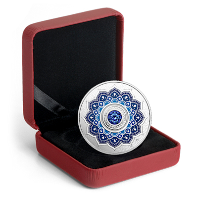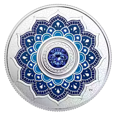 Der Swarovski-Kristall auf der Silbermünze bildet die faszinierende Farbe eines blauen Saphirs sehr gut nach. Er steht im Mittelpunkt eines mandala-ähnlichen Motivs. Zu erkennen ist eine stilisierte Lotosblüte mit zwölf Blütenblättern für die zwölf Monate des Jahres. Der Kristall ist umgeben von kolorierten Bereichen, wobei die Blautöne von innen nach außen immer dunkler werden. Die in höchster Proof-Qualität geprägte Silbermünze hat einen Durchmesser von 27 Millimetern und enthält 1/4 oz Feinsilber (Feingehalt 99,99 Prozent). Der Münzrand ist geriffelt. Auf der Wertseite findet man das Susanna-Blunt-Porträt von Königin Elizabeth II. und den Nennwert 5 CAD. Das Sammlerstück wird gekapselt, im Etui und mit nummeriertem Echtheitszertifikat ausgegeben.