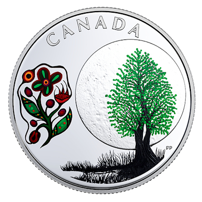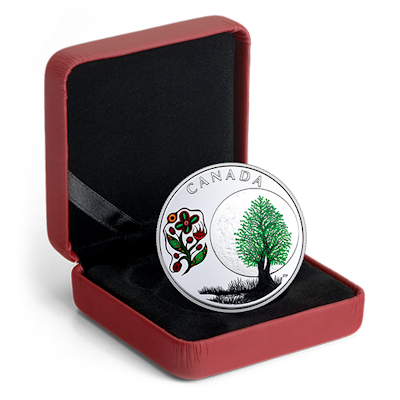 Die Silbermünze zeigt links die Thimbleberry in den verschiedenen Stadien ihrer Entwicklung: als Blüte, als unreife Frucht und als saftige Beere. Ein Trieb läuft vom Stamm der Pflanze zu einer Kreisdarstellung, die die Verbindung zwischen allen Wesen und den Kreislauf des Lebens symbolisiert. Daneben ist ein Baum abgebildet, der ebenfalls mit Farbapplikationen gestaltet ist und auf den Sommerausgaben sattgrüne Blätter trägt. Hinter dem Baum steht der Vollmond groß und rund am Himmel. Die Silbermünze hat einen Durchmesser von 27 Millimetern und wiegt 7,96 Gramm. Der Feingehalt liegt bei 99,99 Prozent. Der Münzrand ist geriffelt. Die Wertseite zeigt über dem Nennwert von 3 CAD das Porträt von Königin Elizabeth II. Das in höchster Proof-Qualität geprägte Sammlerstück wird gekapselt, im Etui und mit einem nummerierten Echtheitszertifikat ausgegeben.