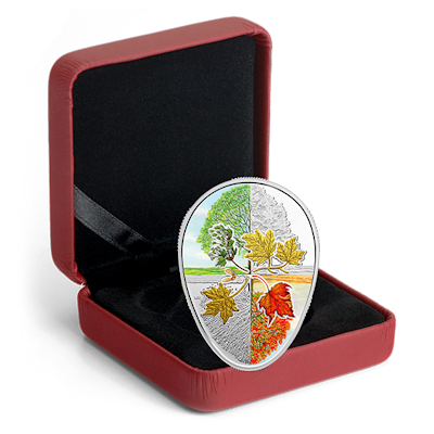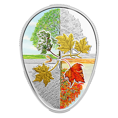 four-seasons-for-the-maple-leaf-1-oz-silber-vergoldetLangsam neigt sich der Sommer dem Ende zu, ein Hauch von Herbst liegt in der Luft und erinnert uns an den ewigen Kreislauf der Jahreszeiten. Doch auch wenn der Abschied von den Sommertagen zunächst schwer fällt: Jede Saison hat ihren ganz eigenen Reiz. Das zeigt die Royal Canadian Mint mit der neuen Silbermünze „Four Seasons of the Maple Leaf“. Koloriert und vergoldet präsentiert das eiförmige Sammlerstück den Zuckerahorn im Wechsel der Jahreszeiten.