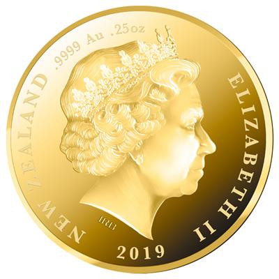 Oben ist der Nennwert von 10 Neuseeland-Dollars verzeichnet. Der Münzrand ist geriffelt. Königin Elizabeth II. ist als offizielles Staatsoberhaupt von Neuseeland umseitig abgebildet. Es handelt sich um das Porträt von Ian Rank-Broadley. Die Goldmünze hat einen Durchmesser von 26 Millimetern und enthält 1/4 oz Feingold (Feingehalt 99,99 Prozent). Zu dem streng limitierten Sammlerstück gehört auch ein nummeriertes Echtheitszertifikat. Verpackt ist die Münze in ein stilvolles schwarzes Etui.