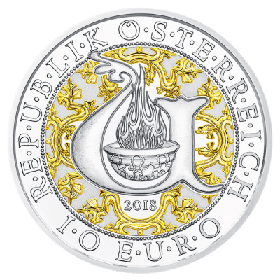 oesterreich-engel-uriel-silber-koloriert-2Anders als Michael, Gabriel und Raphael wird Uriel in der Bibel nicht namentlich erwähnt, wohl aber im 4. Buch Esra, das zu den Apokryphen zählt, und in Schriften des Judentums. In der Ostkirche wird er traditionell verehrt. Im Westen taucht er in der sakralen Kunst auf,  zusammen mit den drei Erzengeln. Da sich sein Name als „Licht/Feuer Gottes“ übersetzen lässt, wird er oft mit Flammen dargestellt. Die Silbermünze greift dieses Attribut in Form einer Feuerschale auf, die von einem U umrahmt wird. Um den Buchstaben ranken sich Blattornamente, die goldgelb koloriert sind. Dieses Motiv ist von einem Rahmen umgeben, auf dem unten der Nennwert von 10 Euro verzeichnet ist.