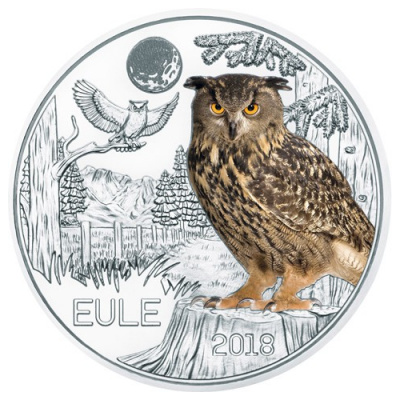 Fast menschenähnlich mutet das Gesicht der Eule an. Geheimnisvoll kommt sie nur nachts zum Vorschein und lässt ihre unheimlichen Rufe hören. Kein Wunder, dass sich schon früh zahlreiche Aberglauben um den Vogel rankten. Einersetits galt er als Hexenvogel und Unglücksbringer. Andererseits soll die Eule aber auch Glück bringen. Im antiken Griechenland war sie der Vogel der Göttin Athene. Bis heute ist sie ein Symbol der Weisheit. Bei der Eule auf dem Münzmotiv handelt es sich um einen Uhu, die größte Eulenart. Mit seinen gelben Augen blickt er zum Betrachter. Das Gefieder hat die typische hellbraune Grundfarbe mit dunklen Streifen. Im Hintergrund ist eine Landschaft mit einem Zaun, einigen Nadelbäumen und Berggipfeln in der Ferne abgebildet. Auf einem Ast sitzt eine weitere Eule mit ausgebreiteten Flügeln. Über ihr steht der Vollmond am Himmel.