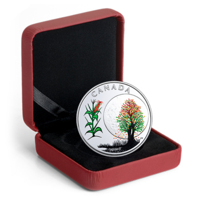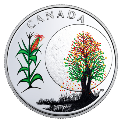 grandmother-moon-corn-moon-silber-koloriertWährend bei uns der August als Erntemond gilt, ließen die Ureinwohner Nordamerikas ihre Feldfrüchte anscheinend länger reifen. Erst der September stand als Corn Moon im Zeichen der Ernte. Ihm ist die neunte Ausgabe der Silbermünzen-Serie „Thirteen Teachings from Grandmother Moon“ der Royal Canadian Mint gewidmet. Das fortschreitende Jahr zeigt sich nicht nur an dem ernetreifen Maiskolben, auch der Baum im Hintergrund hat schon sein Herbstkleid angelegt.