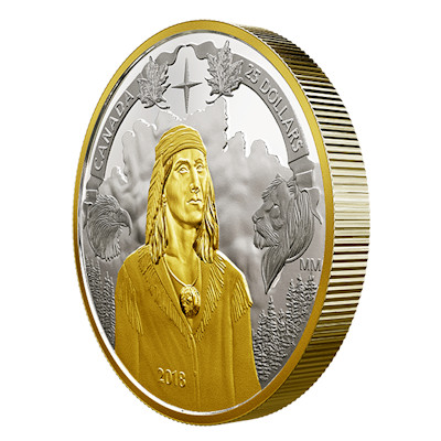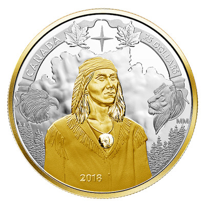 Sein Name bedeutet glühender, aufsteigender Stern: Tecumseh war ein charismatischer Anführer des Clans der Shawnee. Obwohl sein Stammesgebiet zu den USA gehörte, spielte er eine besondere Rolle in der kanadischen Geschichte. Deshalb ehrt ihn die Royal Canadian Mint zu seinem 250. Geburtstag mit einem besonderen Sammlerstück: einer Piedfort-Silbermünze, die zum Teil vergoldet ist. Die Auflage ist auf 6.000 Exemplare limitiert.