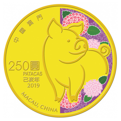 Das Motiv der Goldmünze ist wie bei der Serie üblich zweigeteilt. Die eine Hälfte ist mit einem üppigen Hortensienmuster koloriert: Violette und rosafarbene Blüten mit vereinzelten grünen Blättern bilden den farbenfrohen Hintergrund für den Hauptdarsteller dieser Ausgabe – das Schwein. Schwungvoll gezeichnet präsentiert sich das zwölfte der chinesischen Tierkreiszeichen als rundliches, zufriedenes Glückssymbol. Das Schweinemotiv reicht in die unkolorierte Hälfte hinüber, auf der der Nennwert von  250 Patacas verzeichnet ist, und schafft so eine Verbindung zwischen den beiden Teilen.
