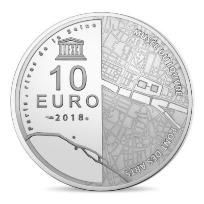 Wie in Deutschland gibt es auch eine französische Münzserie, die UNESCO-Welterbestätten gewidmet ist. Seit 2014 prägt die Monnaie de Paris die Silbermünzen der Seineufer-Serie mit dem Nennwert von 10 Euro, die mit Gold und Rhodium veredelt sind. Das Seine-Ufer in Paris zwischen Pont de Sully und Pont d’Iéna zählt wegen der Vielzahl an historisch bedeutsamen Bauten komplett zum Weltkulturerbe. Nachdem 2016 das Musée d’Orsay und Petit Palais und 2017 das Palais Bourbon mit dem Place de la Concorde an der Reihe waren, folgt 2018 der Louvre mit dem Pont des Arts.