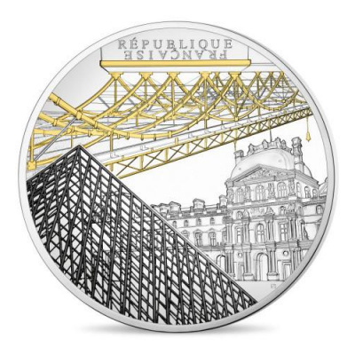 Der Louvre gehört zu den bekanntesten Sehenswürdigkeiten der französischen Hauptstadt. Und er ist eng mit dem Pont des Arts verbunden, denn dem Kunstmuseum verdankt die Brücke ihren klangvollen Namen. Mit dem Louvre auf der einen und dem Institut de France auf der anderen Seite ist die Fußgängerbrücke über die Seine, die einst die erste Eisenbrücke von Paris war, eine der Hauptrouten für Touristen. Filigran spannen sich ihre vergoldeten Bögen über die obere Hälfte der Silbermünze. Will man den Louvre betrachten, stellt man die Brücke auf den Kopf. Die untere Hälfte zeigt im Vordergrund die von dem Architekten Ieoh Ming Pei gestaltete Glaspyramide. Dieses Element ist durch Rhodium hervorgehoben und bildet so das dunkle Gegenstück zur goldglänzenden Brücke. Im Hintergrund ist der Palais du Louvre zu sehen. Der ehemalige Königspalast wurde aufgegeben, als Ludwig XIV. mit dem Hof nach Versailles umsiedelte und wurde schon zu Zeiten der Französischen Revolution zum Museum.