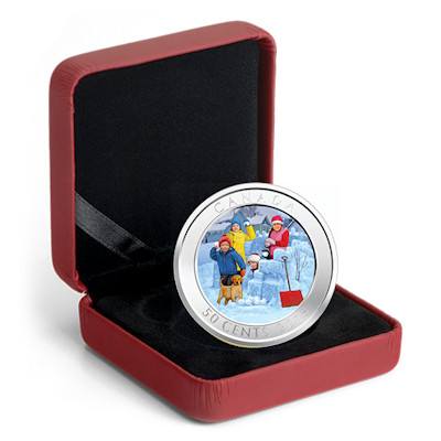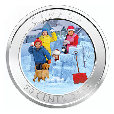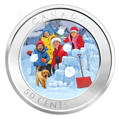 Kinder im schneesicheren Kanada haben vermutlich mehr Erfahrung mit Schneeballschlachten, aber auch in Deutschland kennt jeder den Spaß dieses friedfertigen Kampfes. Die Kinder auf dem Motiv der Münze gehen gut vorbereitet in die Schlacht. Sie haben nicht nur einen beträchtlichen Vorrat an Geschossen, sondern auch ein aus Schneeblöcken aufgetürmtes Fort, um dahinter in Deckung zu gehen. Im Vordergrund ist noch die rote Schneeschaufel zu sehen, mit der sie ihren Verteidigungswall gebaut haben. Dick eingepackt in warme Wintersachen können sie sich nach Herzenslust im Schnee austoben. Auch ein junger Hund ist mit von der Partie.