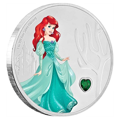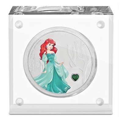 Glitzer und Funkeln bringt die neue Disney-Prinzessinnen-Serie der New Zealand Mint in die Münzsammlung: Jede der Silbermünzen ist mit einem Schmuckstein verziert und zeigt eine farbige Prinzessin mit glitzerndem Oberteil. Nach Cinderella und Belle ist jetzt Arielle an der Reihe. Die kleine Meerjungfrau zeigt sich auf dem Motiv zwar in menschlicher Gestalt, der tiefgrüne, herzförmige Stein ist aber eine Hommage an ihren Fischschwanz.