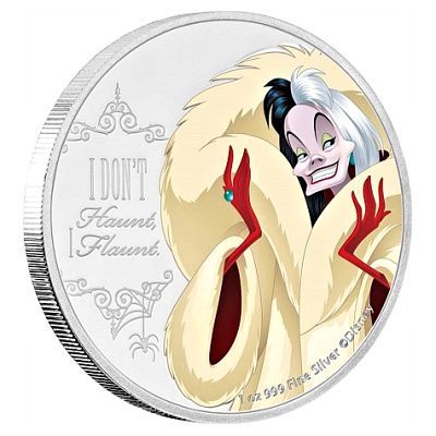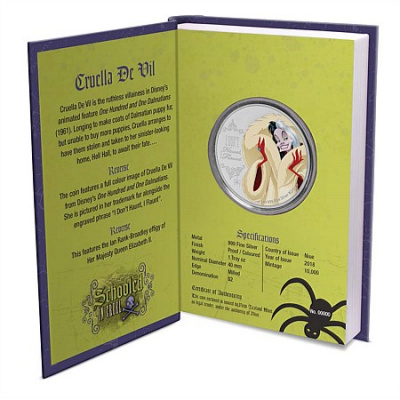 Die Silbermünze zeigt Cruella De Vil in ihrer ganzen gruseligen Opulenz. Aus dem Pelzmantel ragen nur ihre knochigen Finger in blutroten Handschuhen und ihr Kopf mit dem zweifarbigen Haar und einem bösartigen Grinsen auf den Lippen. Unten am Rand sind die Angaben zum Gewicht von 1 oz und dem Feingehalt von 999/1000 zu finden. Hier ist auch vermerkt, dass es sich um ein lizenziertes Disney-Produkt handelt. Das Sammlerstück ist in höchster Proof-Qualität geprägt und hat einen Durchmesser von 40 Millimetern. Der Münzrand ist geriffelt. Die Wertseite zeigt das Porträt von Königin Elizabeth II. als offizielles Staatsoberhaupt des Ausgabelandes Niue und den Nennwert von zwei Dollars. Verpackt ist die Silbermünze, zu der ein nummeriertes Echtheitszertifikat gehört, in ein Etui im Stil eines Märchenbuchs.