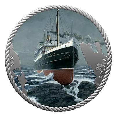 Vor genau 100 Jahren, am 25. Oktober 2018, ereignete sich das größte Unglück in der Schifffahrtsgeschichte der kanadischen Westküste: der Untergang der Princess Sophia. Zum Jahrestag dieses tragischen Ereignisses hat die Royal Canadian Mint der „Titanic des Westens“ eine Silbermünze gewidmet. Mit Farbapplikationen und einem Rahmen, der einem Schiffstau nachempfunden ist, ist sie ein schönes Sammlerstück für Nautik-Fans. Die Auflage ist auf 6.000 Stück limitiert.