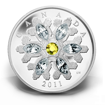 Keine zwei Schneeflocken sind identisch. Von dieser natürlichen Vielfalt ließen sich die Münzdesigner der kanadischen Prägeanstalt inspirieren. Neben der unterschiedlichen Gestaltung der Flocken sorgen zusätzlich die Swarovski-Kristalle für Abwechslung bei den Motiven. Bei diesem Exemplar hat der Stein im Zentrum eine goldgelbe Farbe wie ein Topas – der übrigens der Geburtsstein des Monats November ist. Ringsum sind sechs längliche weiße Kristalle platziert, die das Strahlen des gelben Steins noch hervorheben. Unten ist noch Platz für das Prägejahr 2011.