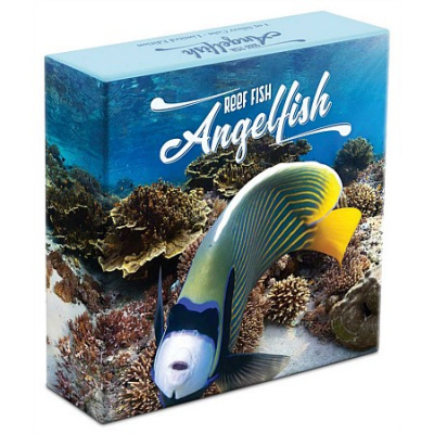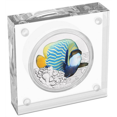 Auf dem Motiv der Silbermünze ist der aufwendig kolorierte Imperator-Kaiserfisch in eine liebevoll gestaltete, silberne Korallenlandschaft eingebettet. Die Münzfläche mit 40 Millimetern Durchmesser füllt der Fisch fast vollständig aus. Unten findet man die Informationen zum Gewicht von 1 oz und dem Feingehalt von 999/1000. Die Wertseite des in höchster Proof-Qualität geprägten Sammlerstücks zeigt das Porträt von Königin Elizabeth II. von Ian Rank-Broadley. Die Queen ist das offizielle Staatsoberhaupt des Ausgabelandes Niue. Der Nennwert ist mit 2 Dollars angegeben. Der Münzrand ist geriffelt. Verpackt in ein Präsentationsetui lassen sich die prächtigen Rifffische wunderbar ausstellen. Ausgeliefert werden sie in einem Shipper, der ebenfalls einen Kaiserfisch zeigt. Hier ist auch der englische Name Angelfish verzeichnet. Ein nummeriertes Echtheitszertifikat gibt es ebenfalls dazu.