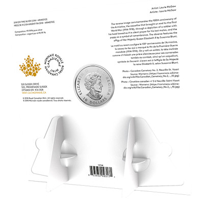 100-jahre-erster-weltkrieg-half-oz-silber-3Das Sammlerstück enthält 1/2 oz Feinsilber und hat einen Feingehalt von 99,99 Prozent. Der Durchmesser beträgt 34 Millimeter. Der Münzrand ist geriffelt. Die Wertseite zeigt das Porträt von Königin Elizabeth II. und den Nennwert von 10 CAD. Die Silbermünze ist in Specimen-Qualität geprägt und wird verpackt in eine Karte ausgeliefert, auf deren Motiv die roten Mohnblumen im Vordergrund hervortreten. Im Hintergrund ist ein Soldatenfriedhof zu sehen. Die Karte kann man aufstellen, sodass die Münze sich schön präsentieren lässt.