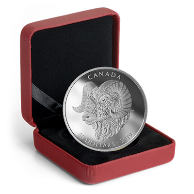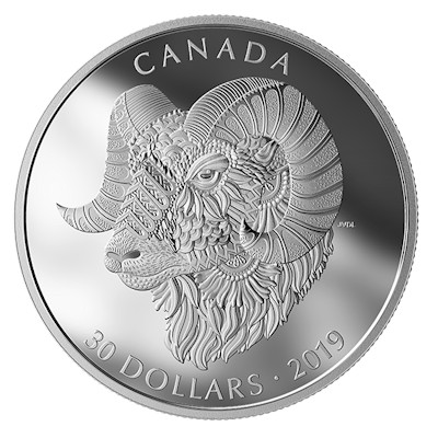 Die Silbermünze zeigt den Kopf eines Dickhornschafs, darunter den Nennwert von 30 CAD und das Prägejahr 2019. Sie hat einen großen Durchmesser von 50 Millimetern und enthält 2 oz Feinsilber (Feingehalt: 99,99 Prozent). Der Münzrand ist geriffelt. Umseitig ist das Susanna-Blunt-Porträt von Königin Elizabeth II. zwar nicht im Zentangle-Stil gestaltet, aber immerhin durch ein Hintergrundmuster besonders in Szene gesetzt. Die Münze kommt gekapselt und im Etui zum Münzsammler; ein nummeriertes Echtheitszertifikat ist inklusive.