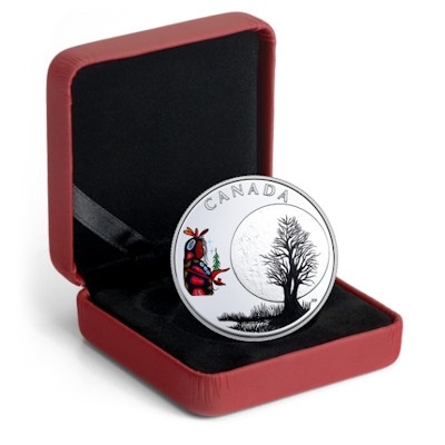 Little Spirit Moon, der Dezember, ist eine Zeit, um gesund zu werden. Die langen Nächte und ruhigen Tage der Jahreszeit sind ideal dafür, um in sich zu gehen und Kraft zu schöpfen. Die zwölfte Ausgabe der Silbermünzen-Serie „Thirteen Teachings from Grandmother Moon“ verleiht diesem traditionellen Glauben der Anishinabe-Stämme Ausdruck – mit einem liebevoll gestalteten und kolorierten Motiv im Woodland-Stil. Die Auflage ist auf 4.000 Stück limitiert.