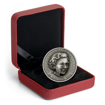 Im Dreiviertelprofil abgebildet, ragt das Porträt dank High Relief eindrucksvoll hervor. Als Hommage an das Ausgabeland Kanada ist es von Ahornblättern umrahmt. Zusätzlich ist das Sammlerstück mit Antik-Finish gestaltet. Es hat einen Durchmesser von 36,07 Millimetern und ein Gewicht von 34,1 Gramm. Der Feingehalt liegt bei 99,99 Prozent. Unten ist der Nennwert von 25 CAD verzeichnet. Umseitig findet man das gewohnte Porträt der Queen von Susanna Blunt. Die Silbermünze hat einen geriffelten Rand und wird gekapselt, im Etui sowie mit einem nummerierten Echtheitszertifikat ausgegeben. Die Auflage ist auf 4.500 Stück begrenzt.