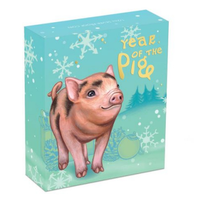 Geschenke, eine Christbaumkugel und Tannenzapfen im Hintergrund geben dem Motiv eine weihnachtliche Note. Rechts findet man das chinesische Schriftzeichen für Schwein und die Aufschrift „Year of the Pig“. Natürlich ist das Sammlerstück aus 1/2 oz Feinsilber (Feingehalt 99,99 Prozent) in höchster Proof-Qualität geprägt. Es hat einen Durchmesser von 32,6 Millimetern und eine maximale Dicke von 2,60 Millimetern. Die Wertseite zeigt das Porträt von Königin Elizabeth II. über dem Nennwert von 50 Cents. Ausgabeland ist Tuvalu. Der Münzrand ist geriffelt. Verpackt ist diese niedliche Geschenkidee in ein Etui und einen fröhlichen Shipper, der das Schweinchen mit Schneeflocken zeigt. Die Auflage ist auf 7.150 Stück limitiert. Ein nummeriertes Echtheitszertifikat gibt es dazu.