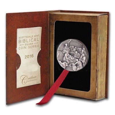 In der „Biblical Series“ bringt die Scottsdale Mint Themen aus dem Alten und Neuen Testament zu den Münzsammlern. Da darf natürlich eine Silbermünze zu Christi Geburt nicht fehlen. Das weihnachtliche Sammlerstück aus 2 oz Feinsilber ist wie die Vorgängerausgaben detailreich gestaltet und mit einem Antik-Finish versehen. Das Etui, das einer Bibel nachempfunden ist, komplettiert den prächtigen Gesamteindruck. Die Auflage ist auf nur 1499 Stück limitiert; die Seriennummer ist jeweils in den Münzrand eingraviert.