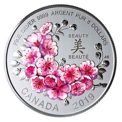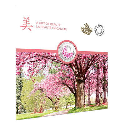 Oben ist der Nennwert von 8 CAD verzeichnet. Das Sammlerstück aus 7,96 Gramm Feinsilber hat einen Durchmesser von 27 Millimetern und einen Feingeahlt von 99,99 Prozent. Der Münzrand ist geriffelt. Umseitig findet man das Susanna-Blunt-Porträt von Königin Elizabeth II. Die Silbermünze wird verpackt in eine Karte mit einem Bild der Kirschblüte ausgeliefert. Besonders praktisch: Dank eines Aufstellers lässt sich die Münze gut geschützt in der Verpackung präsentieren – zu Weihnachten und zu jeder anderen Gelegenheit.