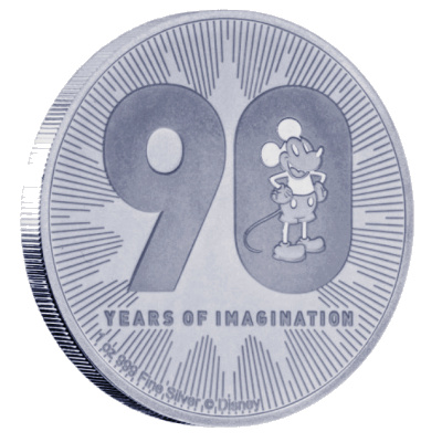 Die silberne Anlagemünze zeigt eine große 90 mit Micky Maus in der Null. Die Darstellung ist deutlich den ersten Filmen mit der Maus nachempfunden. Zusammen mit dem Schriftzug unten lässt sich das Motiv als „90 Years of Imagination“ (90 Jahre Fantasie) lesen. Die Silbermünze hat einen Durchmesser von 40 Millimetern und einen geriffelten Rand. Auf der Wertseite ist das Porträt von Königin Elizabeth II. zu sehen. Die Queen gilt als offizielles Staatsoberhaupt des Ausgabelandes Niue. Der Nennwert beträgt zwei Dollars. Die Auflage ist auf 90.000 Exemplare limitiert, die zu 25 Stück in Tubes verpackt sind.