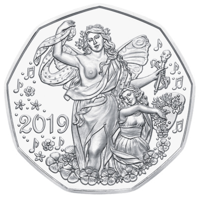 Die Wiener Staatsoper gehört heute zu den renommiertesten Opernhäusern der Welt. Neben dem hochkarätigen Ensemble sorgen internationale Gaststars und die Orchestermusiker der Wiener Philharmoniker für exzellenten Musikgenuss. Das erste Stück, das 1869 auf dem Spielplan stand, war Mozarts Don Giovanni. Auch damals konnten die Operngäste bereits das Wandgemälde mit dem Titel „Ballett“ bewundern, dem das Münzmotiv entlehnt ist. Es zeigt eine schreitende Dame mit Schmetterlingsflügeln. Sie ist lose in ein antikes Gewand gehüllt, das einen Teil ihres Oberkörpers frei lässt. Ein Mädchen neben ihr streut Blumen auf ihren Weg. An den Seiten sind einige Blüten und Musiknoten zu sehen. Links findet man außerdem die Jahreszahl 2019.