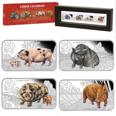 Jede der vier rechteckigen Silbermünzen zeigt ein koloriertes Schwein vor einer silbernen Landschaft. Wenn man alle vier Silbermünzen nebeneinander legt, ergibt sich sogar ein zusammenhängendes Bild. Das chinesische Schriftzeichen für Schwein findet man jeweils in der linken oberen Ecke. Sehr unterschiedlich sind die Schweine: Unschwer zu erkennen ist das gemütlich am Boden sitzende graue Hängebauchschwein. Das schwarz gemusterte Schwein der neuseeländischen Rasse Kunekune posiert mit seinem Ferkel wie für ein Familienfoto. Ebenfalls mit seinem Nachwuchs ist das schwarz gefleckte Gloucestershire Old Spot unterwegs. Ein rötliches Tamworth-Schwein, eine der ältesten Hausschweinrassen, macht das Quartett komplett.