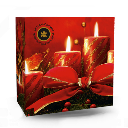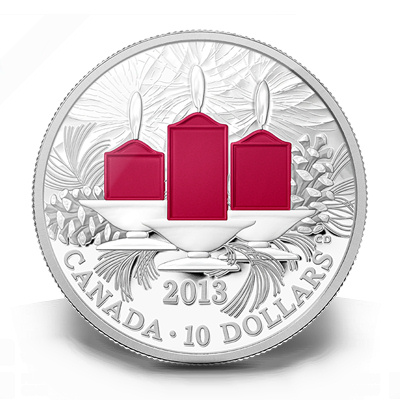 Weihnachtskerzen werden in Kanada natürlich ebenfalls angezündet. Die drei Kerzen auf dem Münzmotiv stehen in identischen Kerzenständern und tragen eine leuchtend rote Emaillierung. Sie sind verschieden hoch: Die größte steht in der Mitte, die mittlere rechts, die kleinste links. Alle drei sind angezündet und werfen einen Lichtkranz auf die Silbermünze. Diese hat einen Durchmesser von 34 Millimetern und enthält zu 99,99 Prozent Feinsilber.