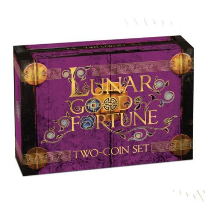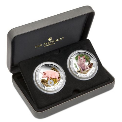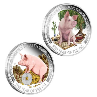 Zwei rosige Hausschweine sind auf den Silbermünzen dieses Glüsckbringers für Münzsammler abgebildet. Das Tier, dass dem Besitzer des Silbermünzen-Sets Wohlstand verheißt, ist vor einem Berg goldener Münzen abgebildet, die teilweise auch in Säcke verpackt sind. Mit den Vorderbeinen steht das Schwein auf einer traditionellen chinesischen Münze in Silber. Das Weisheit versprechende Schwein sitzt auf einer Schriftrolle. Tintenfass, Feder und Bücher sind typische Symbole, die man mit Bildung in Verbindung bringt. Das Motiv zeigt links aber auch einen Bambus, der in China für Langlebigkeit und Ausdauer steht. Hinten ist außerdem eine Weide zu sehen. Ihr wird die Weisheit zugeschrieben, sich zu beugen, und die Stärke, dabei nicht zu brechen. Die Worte „Wealth“ bzw. „Wisdom“ findet man jeweils oberhalb des kolorierten Motivs. Das Prägejahr und die Aufschrift „Year of the Pig“ sind unten am Rand verzeichnet.