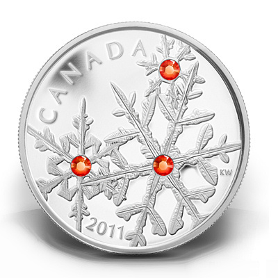 Einen besonders „schneereichen“ Winter erlebten Münzsammler 2011. Gleich vier neue Silbermünzen aus der Snowflakes-Serie brachte die Royal Canadian Mint in diesem Jahr auf den Markt. Die detailreich gestalteten Schneeflocken bestehen aus 99,99 Prozent reinem Feinsilber und sind in höchster Proof-Qualität geprägt. Auf der Hyacinth Red Crystal Snowflake, die im Design der Montana Blue Snowflake entspricht, ist schon ein kleines Schneegestöber versammelt. Drei kunstvolle Schneekristalle sind mit drei leuchtend roten Swarovski-Steinen veredelt, die die zierlichen Schneeflocken erst richtig zur Geltung bringen. Wie jedes der vier Motive hat die Silbermünze eine Auflage von 15.000 Stück.