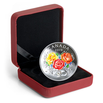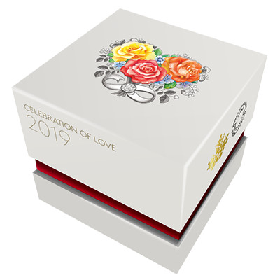 celebration-of-love-2019-silber-verpackungDieses bezaubernde Sammlerstück hat einen Durchmesser von 27 Millimetern und ein Gewicht von 7,96 Gramm. Der Feingehalt beträgt 99,99 Prozent. Der Münzrand ist geriffelt. Die Wertseite zeigt das Porträt von Königin Elizabeth II. und den Nennwert von 3 CAD. Die in höchster Proof-Qualität geprägte Silbermünze ist in ein Etui und einen stilvollen Karton verpackt. Die Auflage ist auf 15.000 Exemplare limitiert, die mit einem nummerierten Echtheitszertifikat ausgegeben werden.
