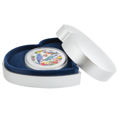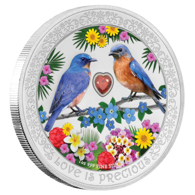 Unzertrennliche, Kolibris , Schwäne und Eisvögel waren in den vergangenen Jahren schon die Liebesboten der New Zealand Mint. Diesmal zeigt das Motiv zwei Hüttensänger (Bluebirds). Diese in Nordamerika heimischen Vögel bleiben ihren Partner oft jahrelang treu. Zwischen den beiden wurde das Zirkonia-Herz in die Silbermünze eingebettet. Ringsum schmücken verschiedene bunte Blüten das Motiv aus. Ein silberner Rahmen mit ornamentalem Muster trägt außerdem die Aufschrift „Love is Precious“ („Liebe ist kostbar“).