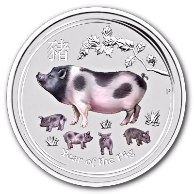 lunar-ii-year-of-the-pig-1-oz-silber-koloriertIm Jahr 2019 regiert das Schwein – zumindest nach dem chinesischen Lunar-Kalender. Nach Maus, Büffel, Tiger, Hase, Drache, Schlange, Pferd, Ziege, Affe, Hahn und Hund ist der zwölfjährige Zyklus nun am Ende angelangt; und mit ihm die Lunar-Serie II der Perth Mint. Zum Abschluss gibt es schön gestaltete Silbermünzen mit Schweinemotiv – unter anderem diese Ausgabe in Stempelglanz-Prägung mit Farbapplikationen.
