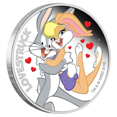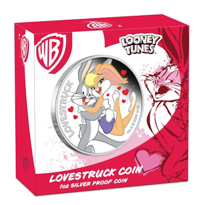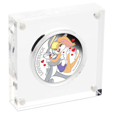 Die beiden Zeichentrickhasen sind mit Farbapplikationen gestaltete und von einigen roten Herzchen umgeben. Links am Rand findet man den Titel „Lovestruck“ (total verknallt). Der Münzrand ist geriffelt. Die Wertseite zeigt das Ian-Rank-Broadley-Porträt von Königin Elizabeth II. Ausgabeland ist Tuvalu. Der Nennwert ist mit einem Dollar angegeben. Die Silbermünze aus 1 oz Feinsilber hat einen Feingehalt von 99,99 Prozent und einen Durchmeser von 40,60 Millimetern. Sie ist in höchster Proof-Qualität geprägt und koloriert. Verpackt ist sie in eine Präsentationsetui aus Acryl und einen hübsch gestalteten Karton. Ein nummeriertes Echtheitszertifikat gehört natürlich auch dazu.