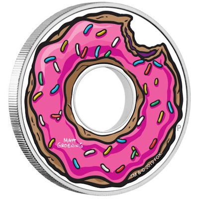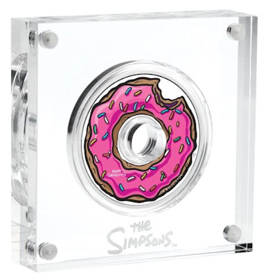 Um Homers Lieblingsspeise gerecht zu werden, haben die Designer der Perth Mint eine Silbermünze mit einem Loch in der Mitte entworfen. Diese Donut-Form wird ergänzt durch leuchtende Farbapplikationen, die die rosafarbene Glasur und die bunten Zuckerstreusel in Szene setzen. Auf dem Zuckerguss findet man auch noch die Unterschrift von Matt Groening, der die Simpsons 1987 erfand. Rechts am Rand ist der Hinweis verzeichnet, dass es sich um ein lizenziertes Produkt handelt.