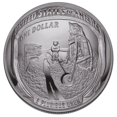 Der Weg bis zur Mondlandung war steinig, allerdings nicht unbedingt lang: Nachdem die UDSSR bereits 1961 einen Kosmonauten ins All geschickt hatte und damit den Vereinigten Staaten zuvorgekommen war, gab Präsident Kennedy das Ziel aus, noch vor dem Ende des Jahrzehnts einen Amerikaner auf den Mond zu bringen. Mit den Raumfahrtprogrammen Mercury, Gemini und schließlich Apollo näherten die Amerikaner sich Schritt für Schritt diesem großen Ziel. Alle drei sind auf der Silbermünze verzeichnet, getrennt von verschiedenen Mondphasen. Unten ist das Wort Liberty (Freiheit) zu lesen, rechts das Motto „In God We Trust“. Gottvertrauen brauchten auch die Apollo-Astronauten, denn vieles hätte schief gehen können. Tatsächlich hatte man sogar eine Rede für Präsident Nixon vorbereitet, falls Armstrong und Aldrin auf dem Mond sterben sollten. Doch nicht nur die Landung, auch der Rückflug vom Mond gelang.