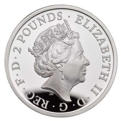 britannia-2019-1-oz-silber-wertseiteDas von dem Künstler David Lawrence gestaltete Motiv entfaltet bei der Ausgabe in höchster Prägequalität Polierte Platte seinen ganzen Detailreichtum. Das Haar der Britannia, durch das der Wind weht, der Faltenwurf ihres Gewandes oder die dichte Mähne des Löwen: Alles zusammen sorgt für ein dynamisches Motiv. Um das Bild läuft ein Rahmen, der von Britannias Helm und Dreizack durchbrochen wird. Hier sind das Prägejahr, Gewicht und der Feingehalt von 999/1000 verzeichnet. Der Münzrand ist geriffelt. Die Wertseite zeigt das Bild einer weiteren britischen Ikone, nämlich der Queen Elizabeth II. Der Nennwert beträgt 2 britische Pfund. Die Silbermünze hat einen Durchmesser von 38,61 Millimetern und wird verpackt in ein Etui ausgeliefert. Ein nummeriertes Echtheistzertifikat gehört dazu, denn die Auflage ist in dieser Version streng limitiert auf nur 3.390 Stück.