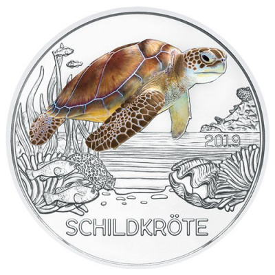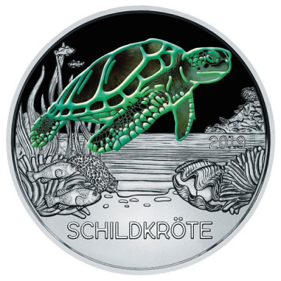 oesterreich-tiertaler-schildkröte-wertseiteFür das Motiv der Münze haben die Designer eine Meeresschildkröte ausgesucht. Ihr Lebensraum zwischen Muscheln und Korallen macht sich als Münzmotiv sicher besser als ein Sumpfgebiet. Die Schildkröte ist mit Farbapplikationen gestaltet. Wie man im Dunkeln sieht, sind ihre Konturen außerdem mit Leuchtfarbe nachgezogen. Rechts findet man das Prägejahr 2019, unten den Namen Schildkröte. Die Wertseite zeigt alle Tiere, die für die Serie ausgewählt wurden, im Kleinformat. Fledermaus, Tiger, Krokodil, Eisvogel, Wolf, Papagei, Hai, Eule und Frosch sind bereits erschienen. Unten ist der Nennwert von 3 Euro verzeichnet. Das Sammlerstück in der Qualität handgehoben hat einen Durchmesser von 34 Millimetern und ein Gewicht von insgesamt 16 Gramm. Zur Tiertaler-Serie gibt es auch ein passendes Sammelalbum, in dem alle Ausgaben Platz haben.