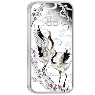 chinese-wedding-2019-1-oz-silber-koloriert-2Über allem steht das Schriftzeichen für „Doppelglück“, das in China als Symbol für Hochzeiten dient. Es setzt sich aus zwei miteinenader verbundenen Zeichen für Glück zusammen. Darunter sind zwei Kraniche beim Balztanz abgebildet. Im März ist die Hauptsaison für dieses elegante Ritual: Mit ausgebreiteten Flügeln laufen die großen Vögel in Kreisen und Kurven umher. Nach der Paarung heben Männchen und Weibchen die Köpfe und lassen im Duett ihre lauten Rufe hören. Diesen Moment haben die Designer des Münzbarrens eingefangen. Unten und an der Seite sind als weiteres Glückssymbol Kirschblüten abgebildet.