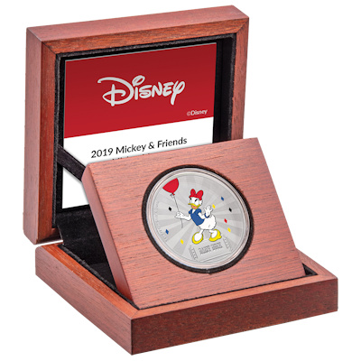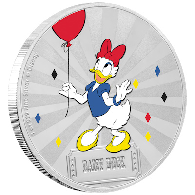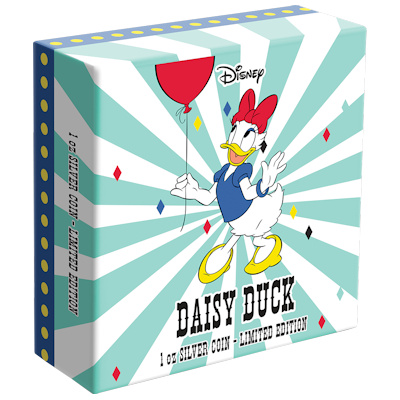 Daisy steht auf einer silbernen Eintrittskarte, die ihren Namen trägt. Außerdem ist sie von bunten Rauten umgeben, die wie Konfetti wirken und den fröhlichen Charakter der Szene unterstreichen. Der Copyright-Hinweis, der das Sammlerstück aus 1 oz Feinsilber als lizenziertes Disney-Produkt ausweist, ist links am Rand zu finden. Die Silbermünze hat einen Feingehalt von 999/1000 und einen Durchmesser von 40 Millimetern. Der Münzrand ist geriffelt. Da Niue das Ausgabeland ist, zeigt die Wertseite das Porträt des offiziellen Staatsoberhaupts Königin Elizabeth II. Der Nennwert ist mit zwei Dollars angegeben. Die Silbermünze wird im Etui und mit einem bunten Shipper ausgeliefert. Ein nummeriertes Echtheistzertifikat gibt es dazu.