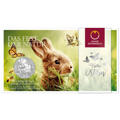 Die Karte zeigt ebenfalls einen Hasen auf einer Blumenwiese, umgeben von Schmetterlingen und Bienen. Unter dem Titel „Das Fest der Natur“ ist die neuneckige Silbermünze in die Karte eingebettet. Rechts findet man außerdem noch Ostergrüße. Die Silbermünze trägt den Nennwert von 5 Euro. Er ist umseitig zu finden, umgeben von den neun österreichischen Landeswappen. Das Sammlerstück hat einen Durchmesser von 28,50 Millimetern und ein Feingewicht von 1/4 oz. Der Feingehalt liegt bei 925/1000. Die Münze ist in der Qualität Handgehoben geprägt und hat eine Auflage von 50.000 Stück.