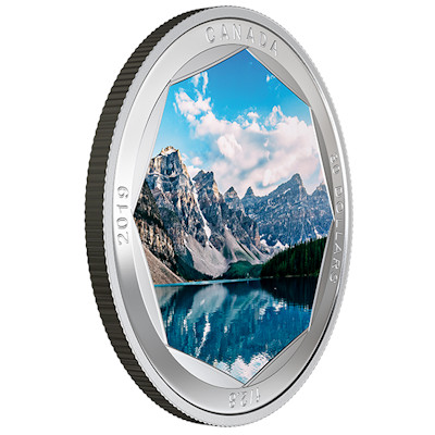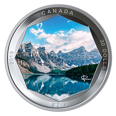 Das Motiv der Silbermünze ist so gestaltet, dass es wirkt, als blicke man durch die Blende einer Kameralinse auf den See und die Berge. Ein Durchmesser von 50 Millimetern sorgt für ein eindrucksvolles Panorama. Rechts am Rand ist der Nennwert von 20 CAD zu finden. Umseitig ist das Susanna-Blunt-Porträt von Königin Elizabeth II. aufgeprägt, das durch einen Hintergrund aus Ahornblättern ergänzt wird. Der Münzrand ist geriffelt. Das Sammlerstück einthält 2 oz Feinsilber bei einem Feingehalt von 99,99 Prozent. Es wird im Etui und zusammen mit einem nummerierten Echtheitszertifikat ausgeliefert. Die Auflage ist auf 5.000 Stück limitiert. Eine weitere Ausgabe zum Mount Rundle schließt die Peter McKinnon Photo Series ab.