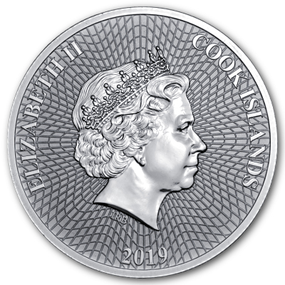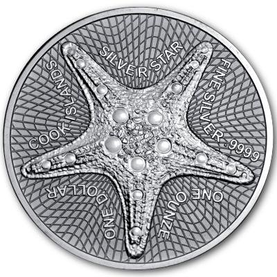 Zwischen den Armen sind oben angefangen im Uhrzeigersinn der Name „Silver Star“ sowie die Angaben zum Feingehalt, Gewicht, dem Nennwert von 1 Dollar und dem Ausgabeland zu lesen. Den netzartigen Hintergrund findet man auf beiden Seiten der Silbermünze, die umseitig ein Porträt von Königin Elizabeth II. zeigt. Diese ist das offizielle Staatsoberhaupt der Cookinseln. Auch das Prägejahr 2019 ist auf dieser Seite zu finden. Die Anlagemünze hat einen Durchmesser von 38,70 Millimetern bei einer Dicke von 3 Millimetern. Der Münzrand ist geriffelt. Die Münzen werden in Stempelglanz-Qualität geprägt und zu je 20 Stück in Tubes verpackt.
