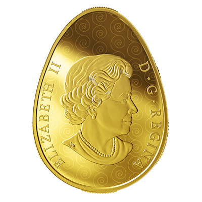 eternal-blessing-pysanka-gold-2Der Münzrand ist geriffelt mit Unterbrechungen. Das goldene Osterei bringt bei einem Feingehalt von 99,99 Prozent 58,5 Gramm auf die Waage. Es ist 45 Millimeter hoch und an der breitesten Stelle 33 Millimeter breit. Umseitig findet man, wie bei den Münzen der Royal Canadian Mint üblich, das Susanna-Blunt-Porträt von Königin Elizabeth II. Die in höchster Proof-Qualität geprägte Goldmünze wird gekapselt, im Etui und zusammen mit einem nummerierten Echtheitszertifikat ausgegeben.