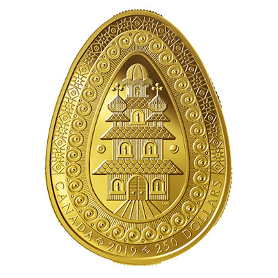 eternal-blessing-pysanka-gold-3Ein Pysanka mit seinen filigranen Dekorationen herzustellen, ist eine aufwendige Arbeit, die Fingerspitzengefühl erfordert. Die Goldmünze gibt die feinen Muster der Ostereier durch ihre detailreiche Gestaltung wieder. Den Mittelpunkt des Motivs bildet ein Tempel, der mit seinen Kuppeln und Zwiebelhauben auch an eine orthodoxe Kirche erinnert. Er ist umgeben von einem Rahmen aus stilisierten Wellen, die das kanadische Motto „A Mari Usque Ad Mare“ – „Von Meer zu Meer“ – symbolisieren. Auf dem äußeren Rahmen wechseln sich Sterne ab mit Vierecken, die für die Erde stehen. Auf diesem Band findet man unten auch das Herkunftsland „Canada“, die Jahreszahl 2019 und den Nennwert von 250 CAD. Die Gestaltung ist laut Prägeanstalt inspiriert von archäologischen Funden, die der Kultur der Skythen zugeordnet werden. Dieses Reitervolk siedelte unter anderem in der Gegend der heutigen Ukraine.