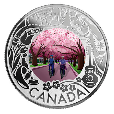 Wie ein weiß-rosa Baldachin spannen sich die Zweige der Kirchbäume auf dem Motiv der Silbermünze über den Weg. Die Schatten sind lang; es herrscht Abendstimmung. Zwei Radler nutzen den Feierabend für einen Ausflug und genießen die zarte Blütenpracht. Die Szene ist in sanften Farben koloriert und bildet einen reizvollen Kontrast zum silbernen Rahmen, der seine eigene Geschichte über Kanadas Besonderheiten und Traditionen erzählt. Oben beim Ahornblatt, dem Nationalsymbol, beginnend sieht man im Uhrzeigersinn unter anderem einen Rodeoreiter, eine Weinflasche mit Glas, einen von Schneeflocken umrahmten Hundeschlitten, eine Gitarre, einen Kirschblütenzweig, einen Krug mit Ahornsirup, einen Wal, eine Tulpe, ein Auto, das auf einer Landstraße durch den Wald unterwegs ist, die Aurora borealis, die Niagarafälle und einen Tannenbaum mit einem Stern auf der Spitze.